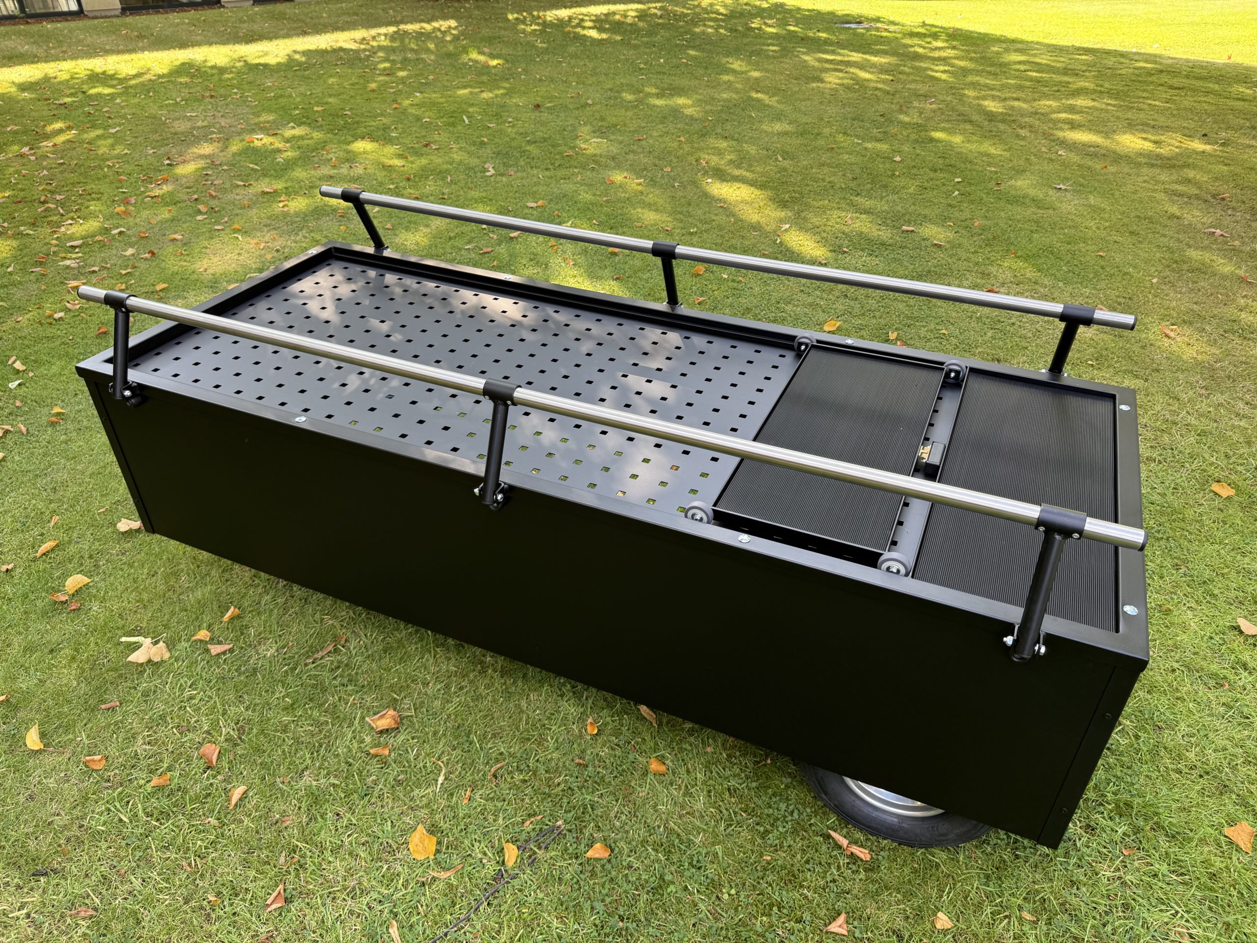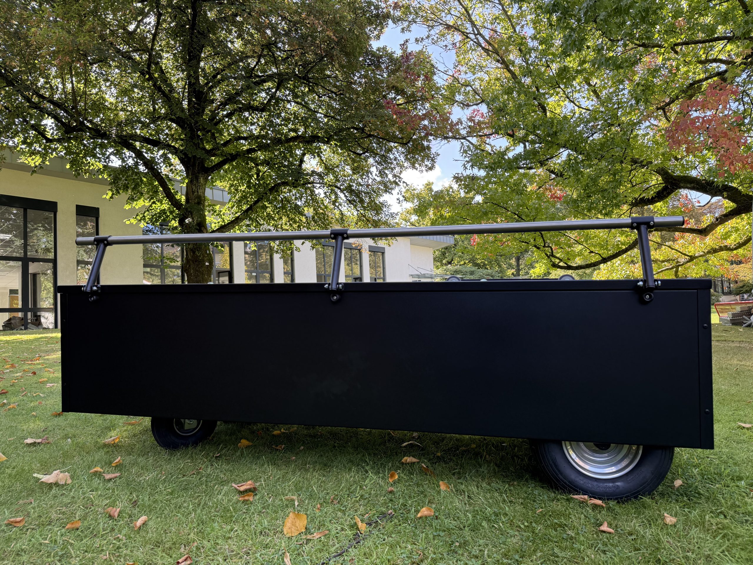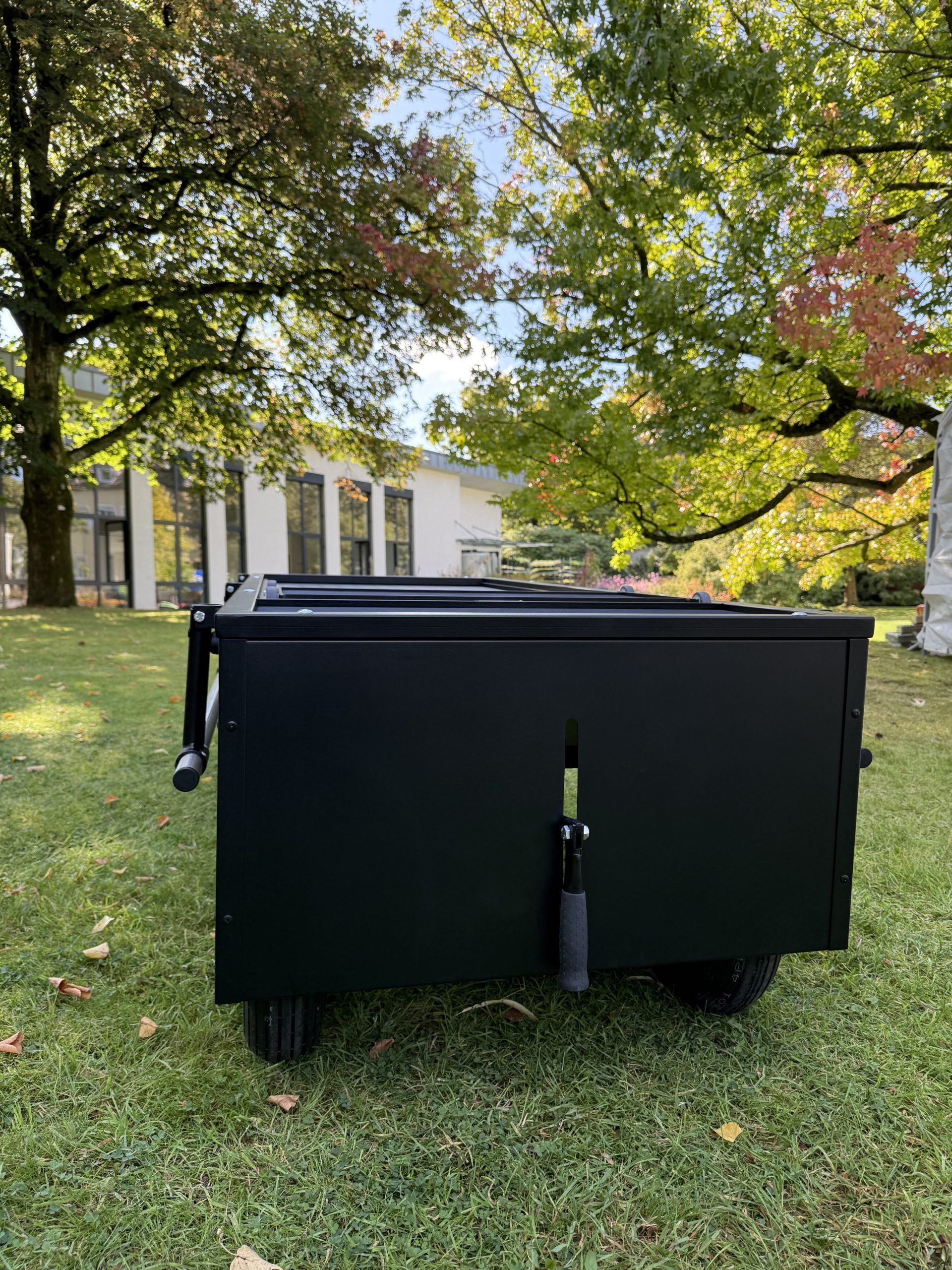 Stabile Stahlkonstruktion mit Blechverkleidung, vier Lufträder, hinten Ø 400 x 100 mm, vorne Lenkrollen Ø 260 x 85 mm,